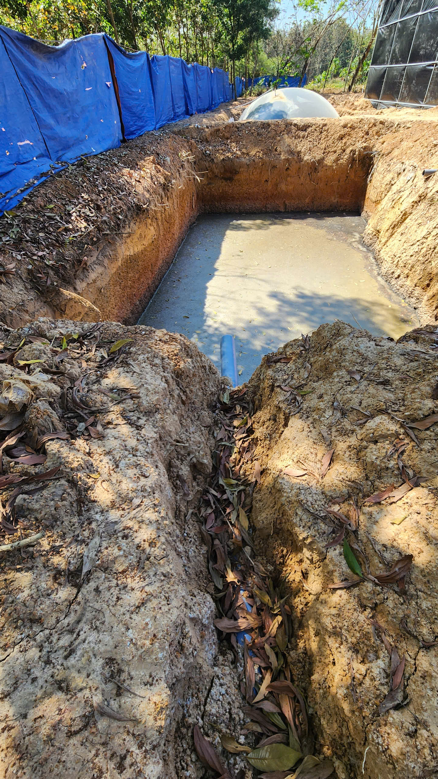 Hiện trạng: Chủ trại đã đào sẵn nhiều hố để dự phòng mở rộng, nhưng trước mắt lắp đặt 2 túi lớn để vận hành ngay.