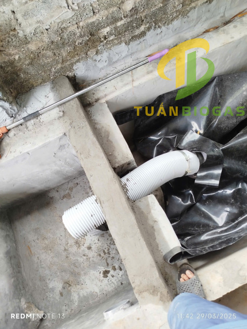 Nối ống nạp phân từ chuồng heo vào túi, nối ống thoát ra bể chứa phân sau.