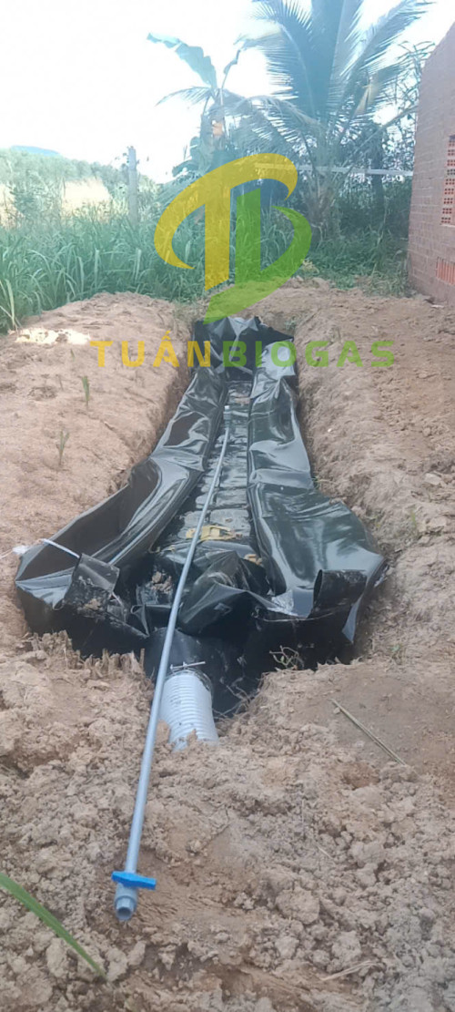 Đặt túi biogas 10 khối xuống hố, chỉnh cân đối.